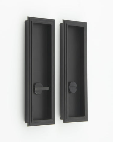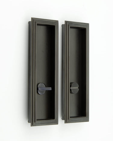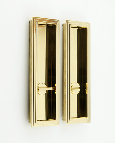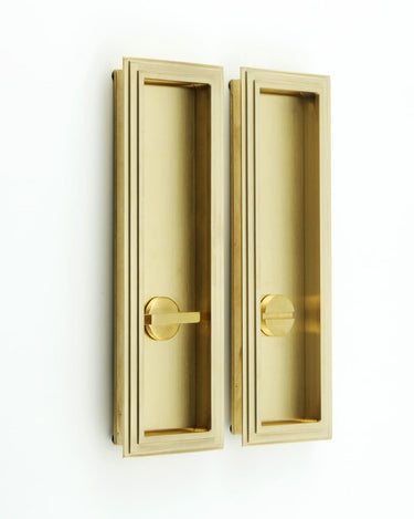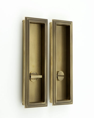 Et eksklusivt indfræst flush pull-sæt i massiv messing med en markant stepped edge-profil. Den skarpe arkitektoniske kant giver dybde og et grafisk udtryk, mens grebet ligger elegant plant i fronten. Den integrerede turn-&-release løsning med 5 mm spindle gør sættet ideelt til badeværelsesdøre, skydedøre og private rum, hvor funktion og æstetik skal gå hånd i hånd. Massiv messing sikrer styrke og en autentisk patina, der udvikler sig smukt over tid.