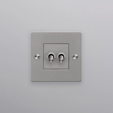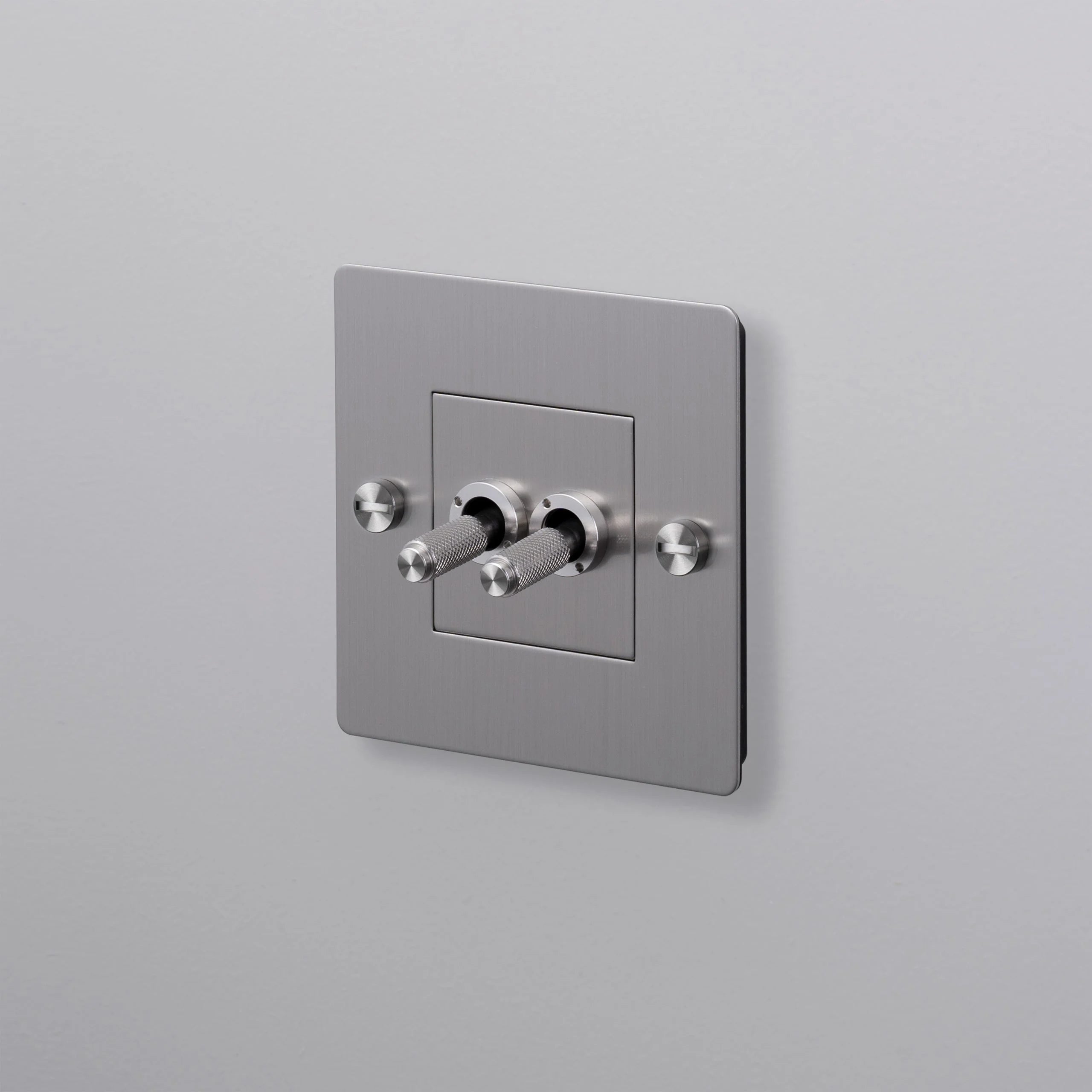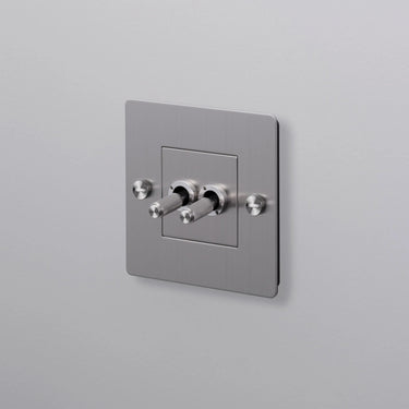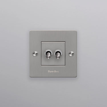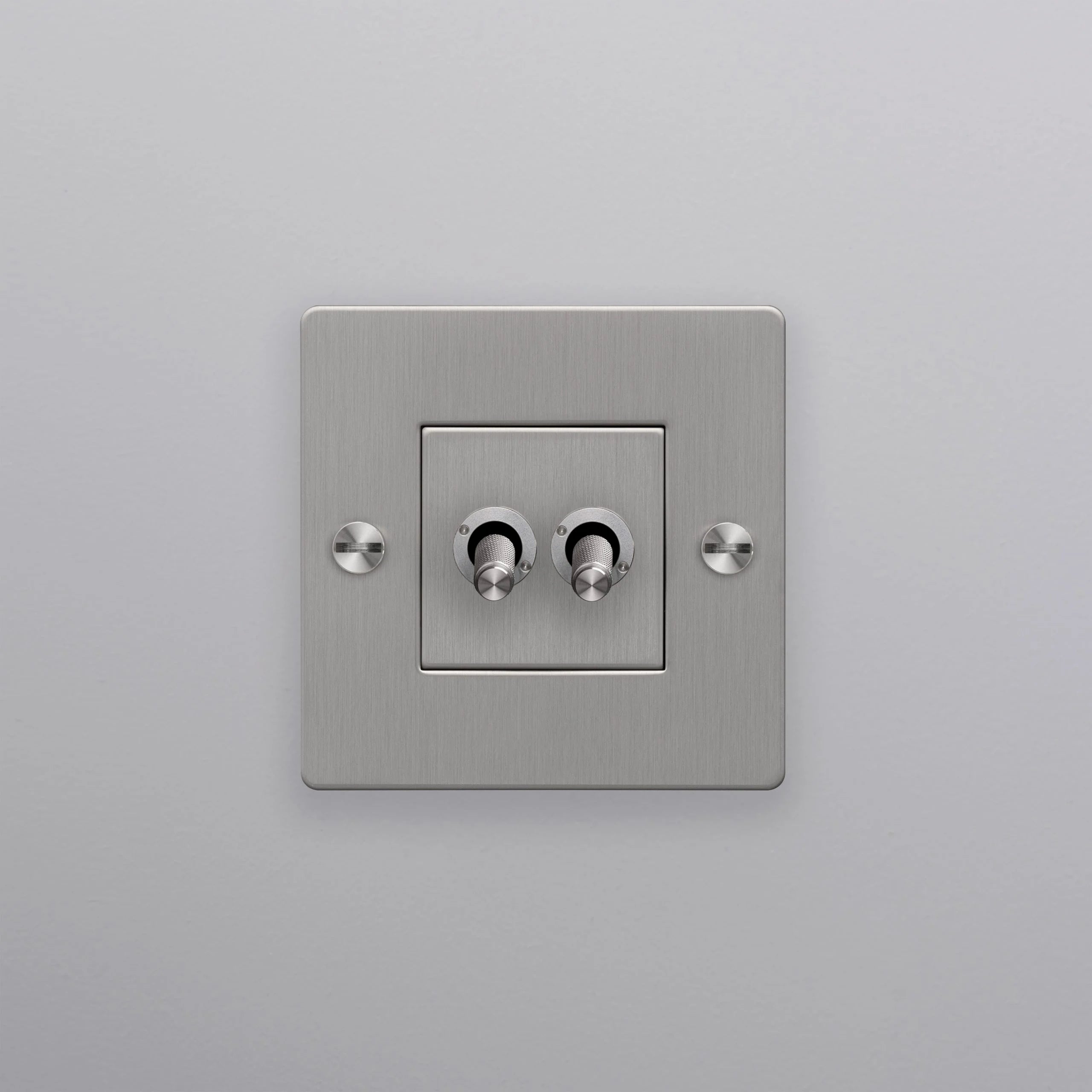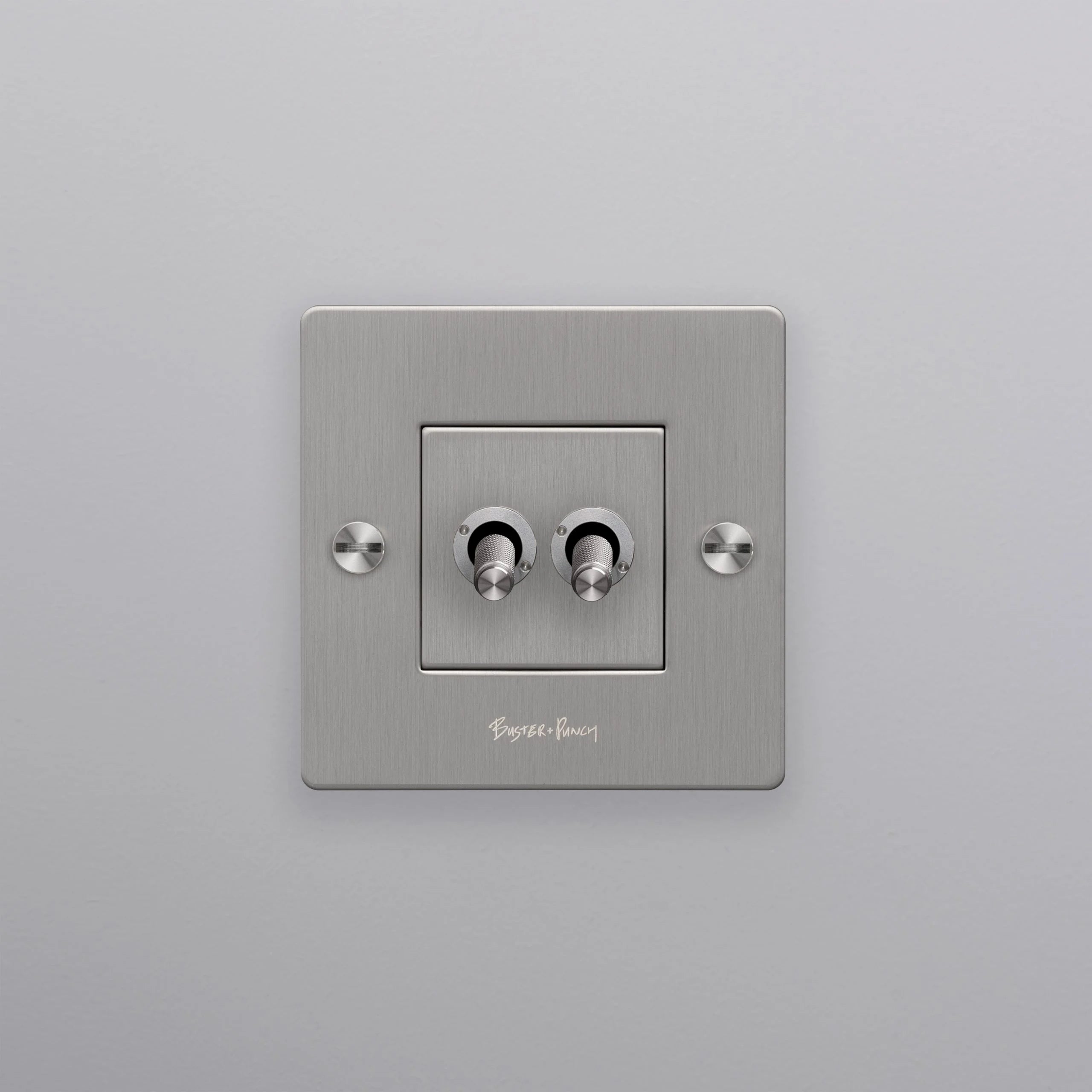 En 2G vippekontakt. Vippekontakten er lavet af solidt metal og har Buster + Punch karakteristiske finesser. Denne kontakt er en 2-vejs model.