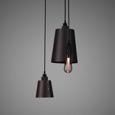 En lysekrone bestående af tre pendler, hver med sin egen tilpassede krog og detaljer i mat gummi. Lyset leveres med en kombination af lampeskærme – 1 stor skærm og 1 lille skærm, lavet af 2 mm rullet stål. Krogene er monteret i en enkelt mat gummi loftroset, som giver mulighed for at tilpasse lyset til forskellige skulpturelle former. Lyset kan yderligere tilpasses ved at fjerne og geninstallere krogene i loftet, hvilket giver mulighed for at sprede pendlerne. Du har mulighed for at vælge én nøgen pære og to skærmpærer. Den nøgne pære er til den enkelt hængende pendel, og skærmpærerne er til de to pendler, der er dækket af skærme. Vi anbefaler at bruge en dæmper for at opnå den bedste belysning. Denne lysekrone fås med pendler i stål, messing eller bruneret messing.