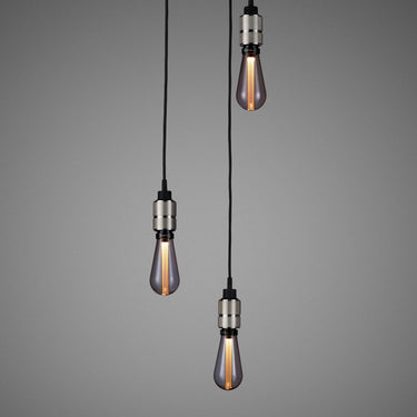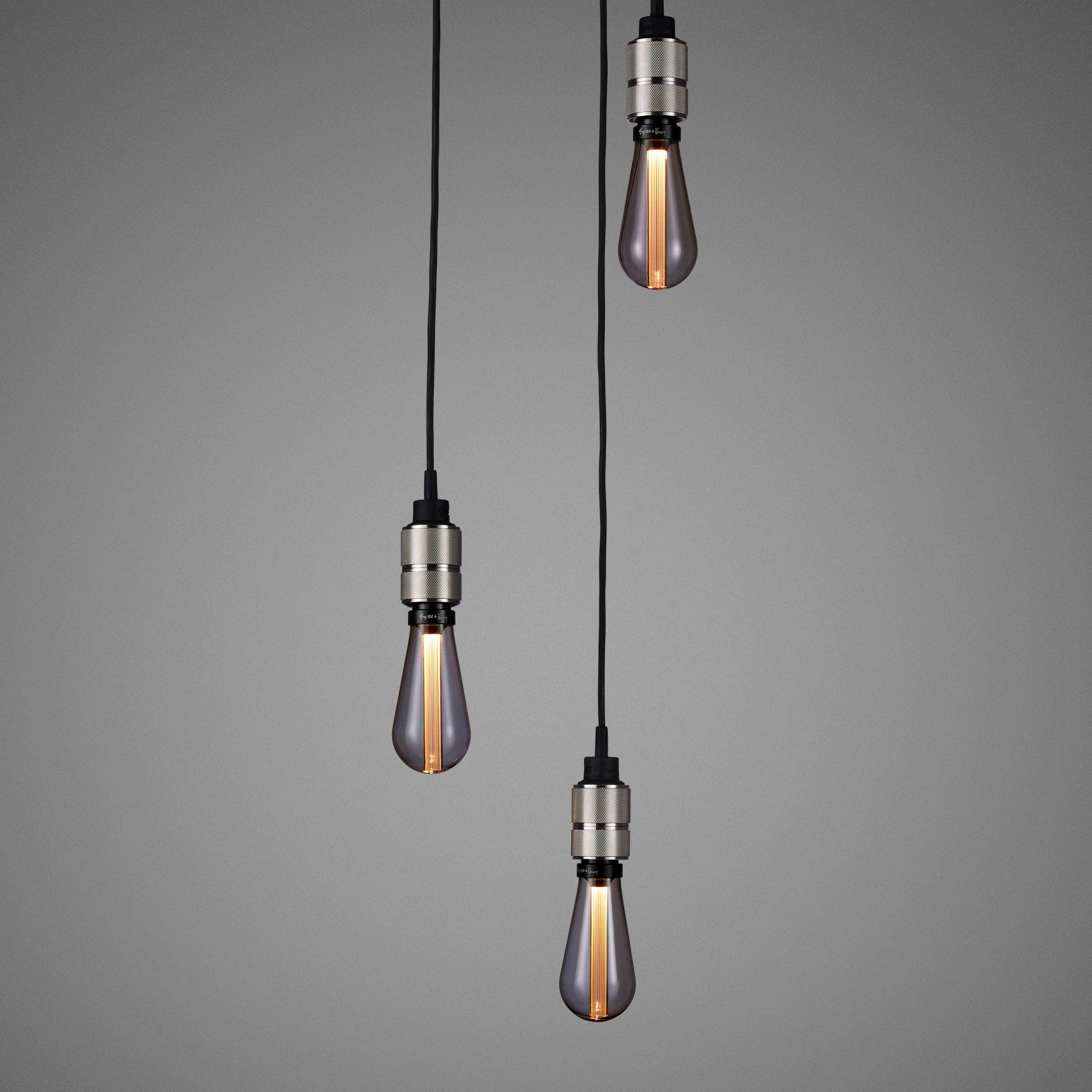 En lysekrone bestående af tre pendellamper, hver med deres egen tilpasningsbare krog og mat gummibelægning. Hver pendellampe kan justeres i længden og hænges op på en solid metalhank, der skrues ind i loftrosen, hvilket sikrer en unik skulpturel form. Krogene kan også installeres direkte i loftet for at sprede pendlerne ud over det møbel, du ønsker. Lampen leveres med et udvalg af pærer, og når du vælger, modtager du 3 pærer til pendellamperne. Vi anbefaler at bruge en dæmperkontakt for at få det bedste ud af denne lampe. Denne lampe fås med pendler i Stål, messing eller Bruneret messing