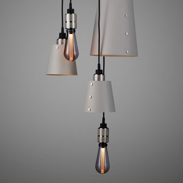 En lysekrone bestående af seks pendellamper, hver med deres egen tilpasningsbare krog og mat gummibelægning. Lampen leveres komplet med en MIX af lysskærme – 1 stor skærm, 2 små skærme, lavet af 2 mm rullet stål og afsluttet med pulverbelægning. Hver pendellampe kan justeres i længden og hænges op på en solid metalhank, der skrues ind i loftrosen, hvilket sikrer en unik skulpturel form. Krogene kan også installeres direkte i loftet for at sprede pendlerne ud over det møbel, du ønsker. Du har valget mellem 3 Nude Bulbs og 3 Shade Bulbs. Nude Bulbs bruges til de tre eksponerede pendler, og Shade Bulbs bruges til de 3 pendler, der er dækket af skærme. Vi anbefaler at bruge en dæmperkontakt for at få det bedste ud af denne lampe.