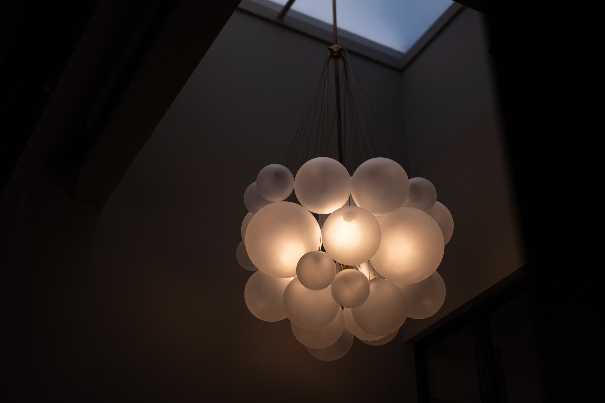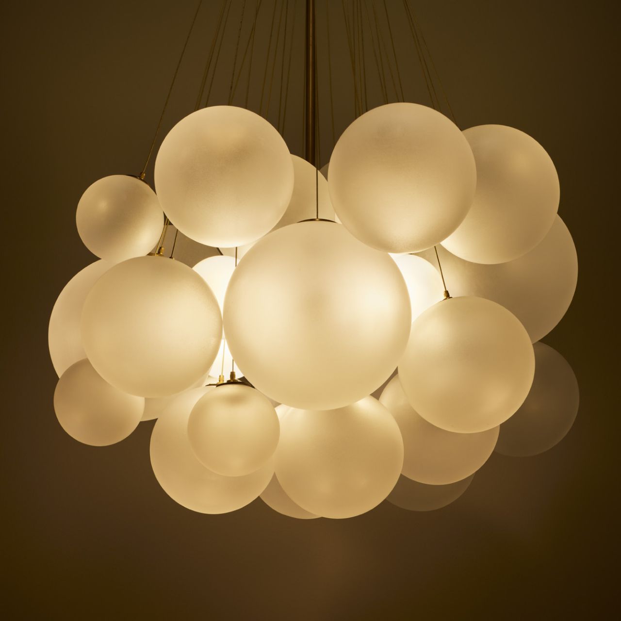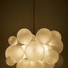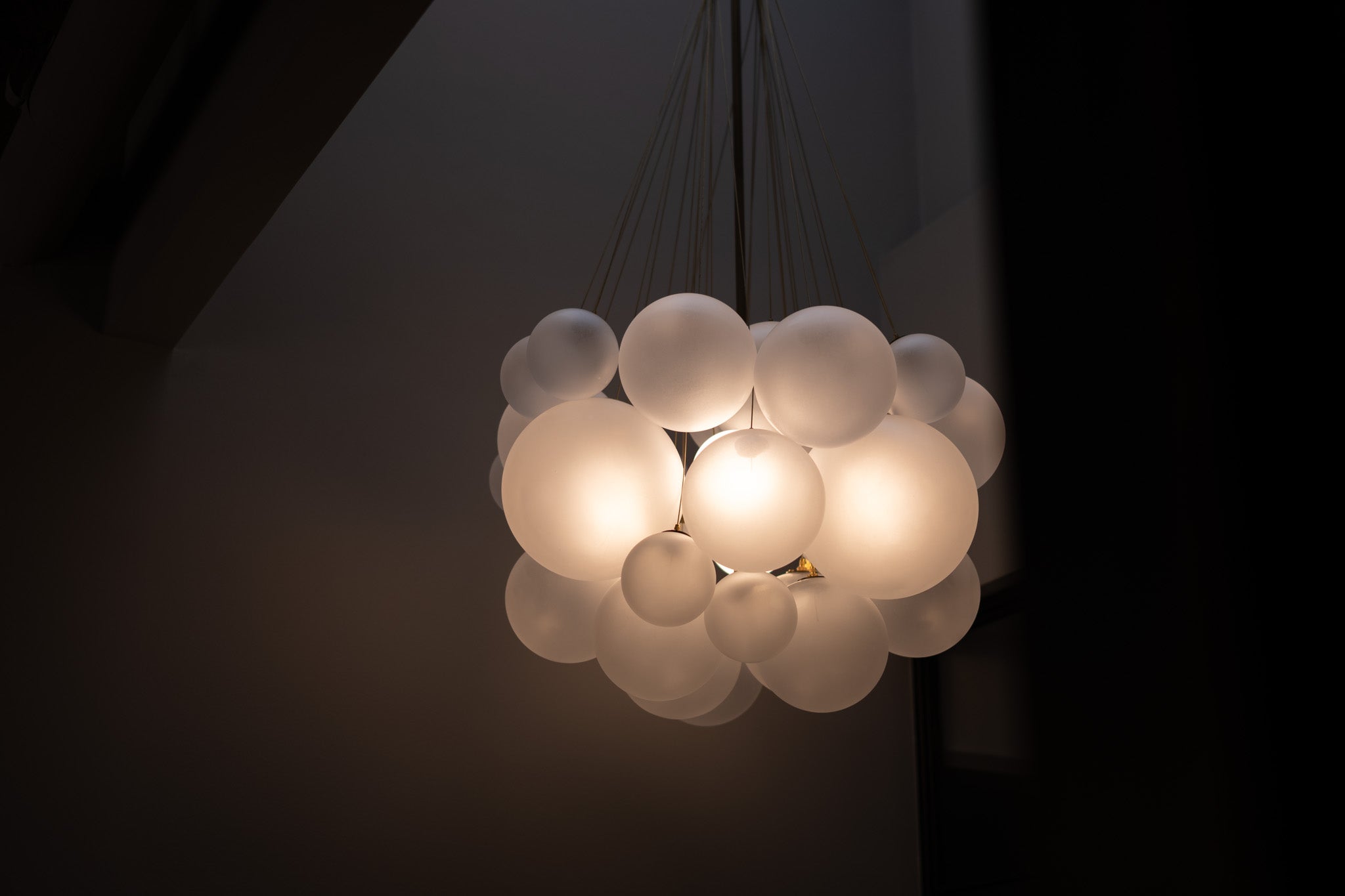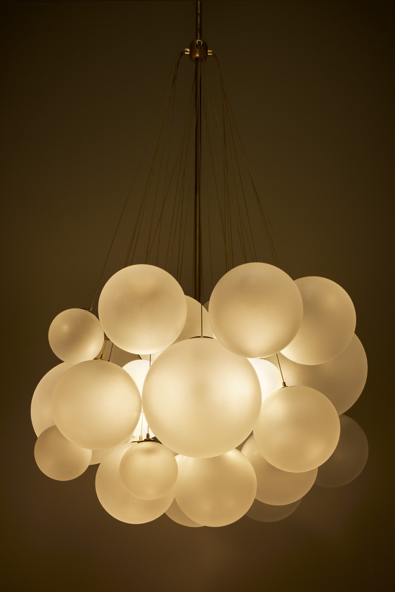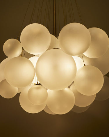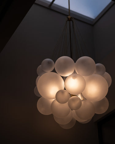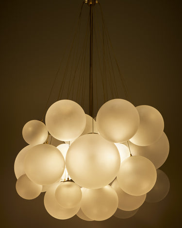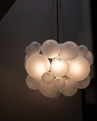 Den afbildede Bubble 32 lampe består af 32 smukt udformede opal glaskupler, der hænger i et sofistikeret og minimalistisk arrangement. Lampen inkluderer 32 kupler i forskellige størrelser: 3 kupler på 20 cm, 15 kupler på 15 cm, og 8 kupler på 10 cm. Denne variation i størrelser skaber en dynamisk visuel effekt, der tilføjer både belysning og kunstnerisk flair til dit rum.