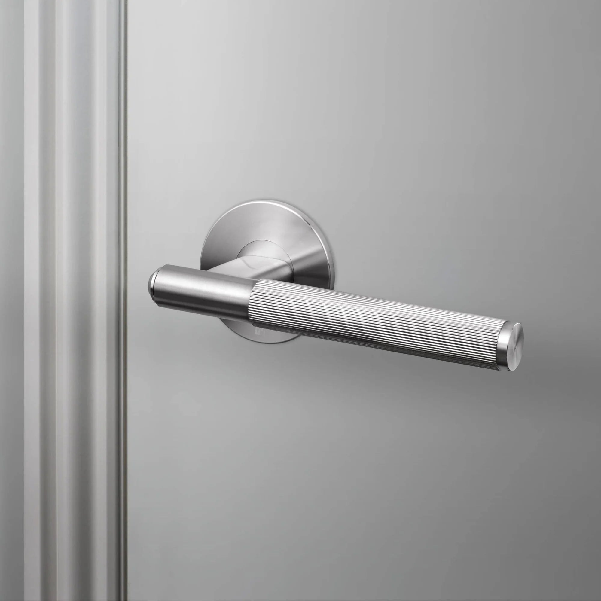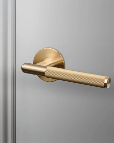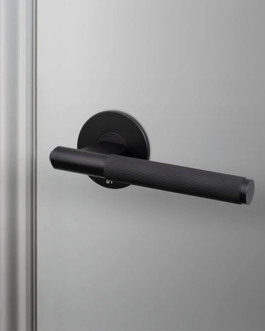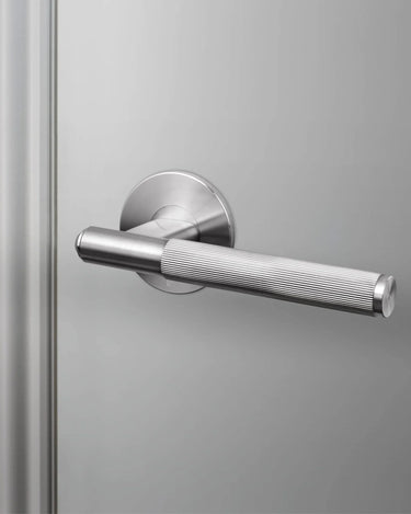 Fast dørhåndtag i solid metal – Udstyret med elegant lineær knurl-detalje og torx-skruer. Perfekt til alle indvendige døre og kan kombineres med vores matchende dørtilbehør. Fås i fire metal-finish: stål, messing, gun metal og svejser-sort