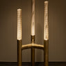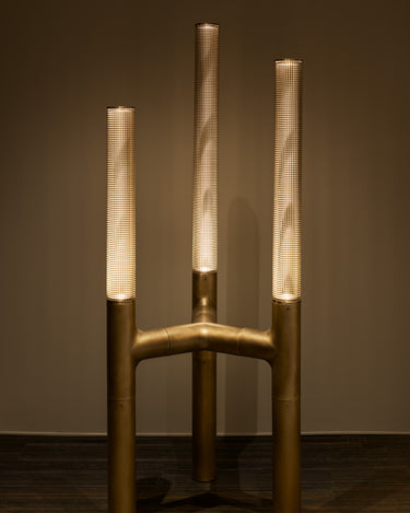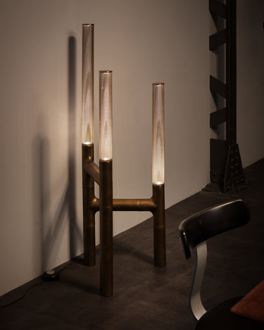 CORAL 3STAND-Y viderefører det organiske formsprog i et fritstående format. Den Y-formede struktur i messing løfter lysarmen op som en gren, og valget mellem frostet glas og industrielt net gør det muligt at tilpasse udtrykket – fra blødt og roligt til grafisk og råt.