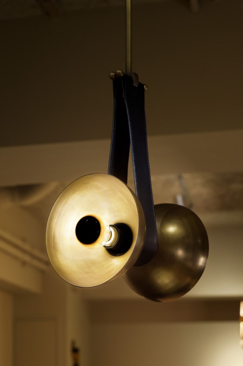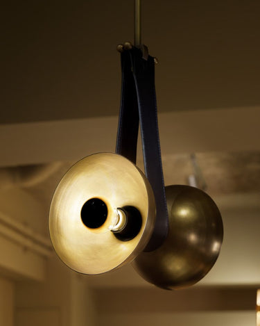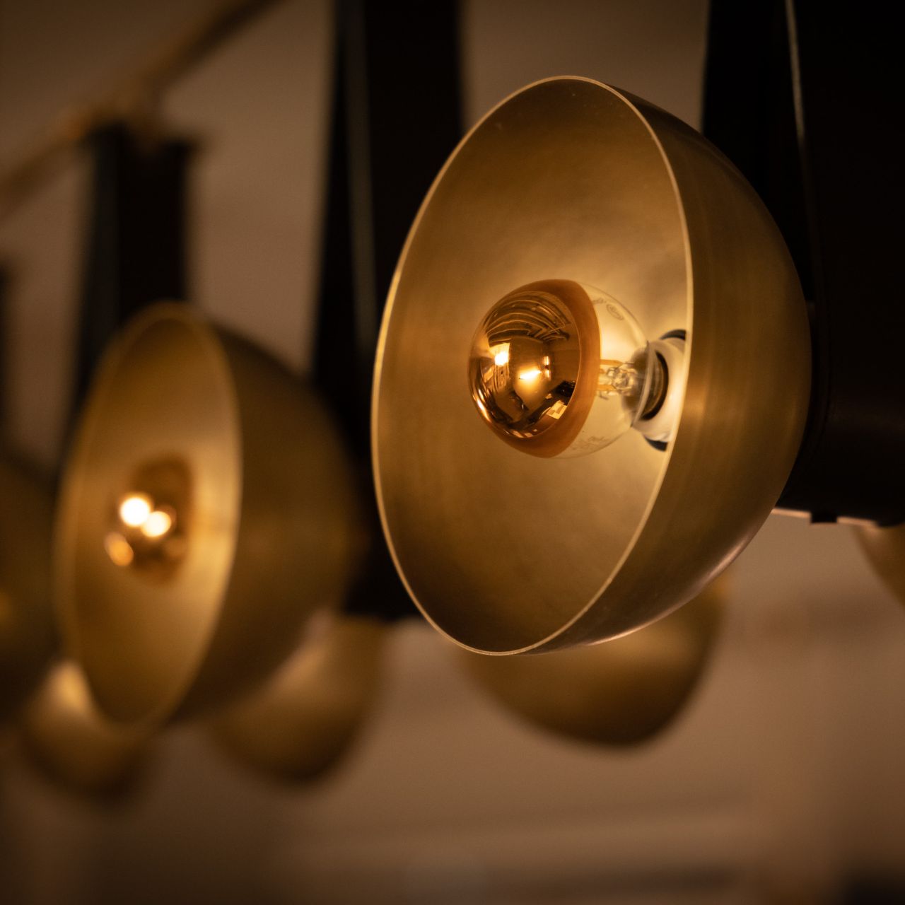 Lamperne hænger elegant i kunstlæderstropper og tilfører rummet både lethed og karakter. Den varme LED-lyskilde (2.700 K) giver et blødt og stemningsfuldt skær, der fremhæver messingens struktur og glød.