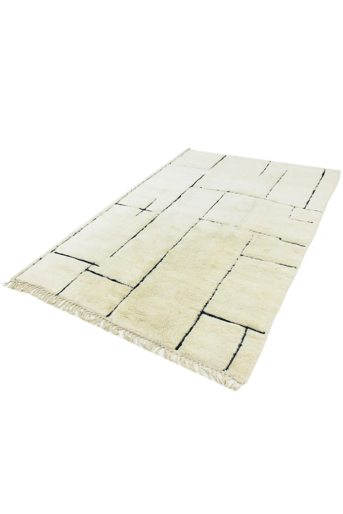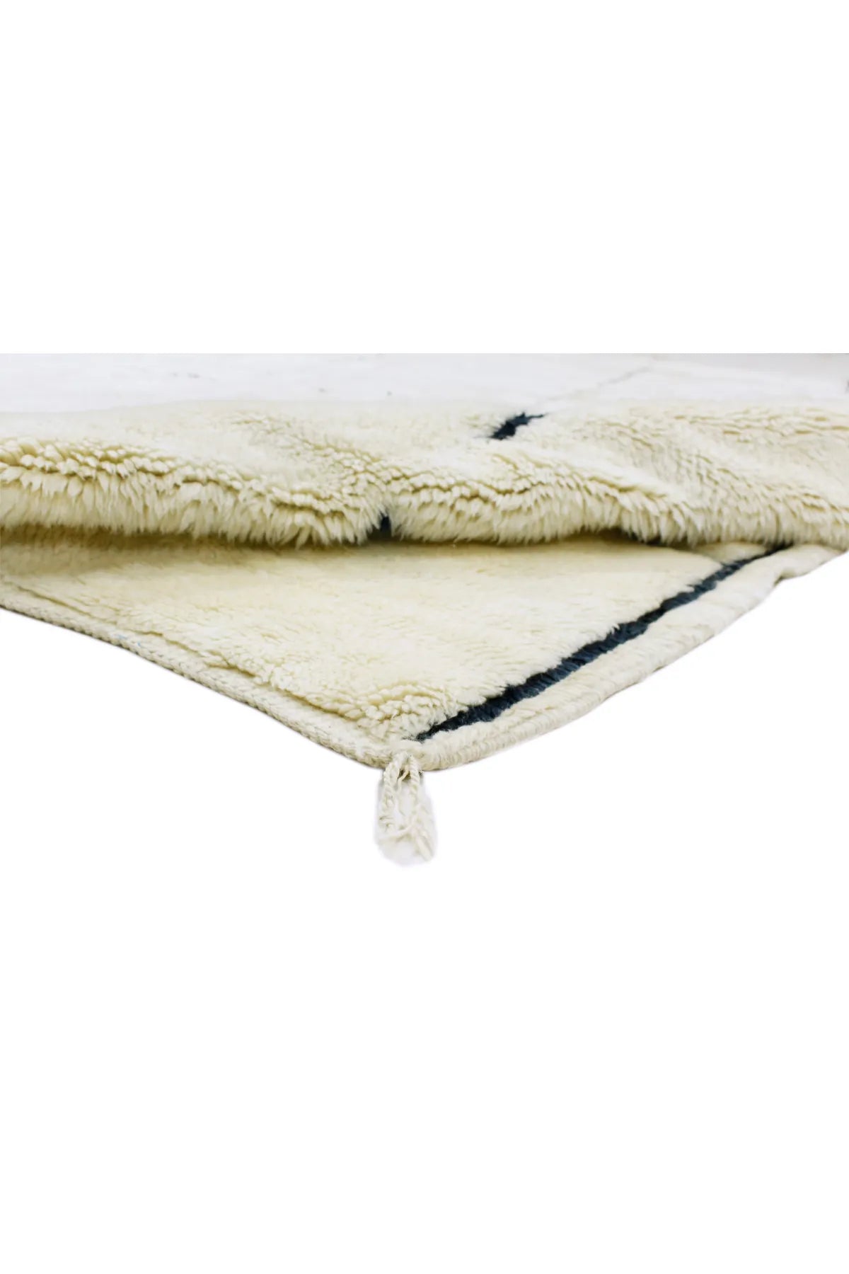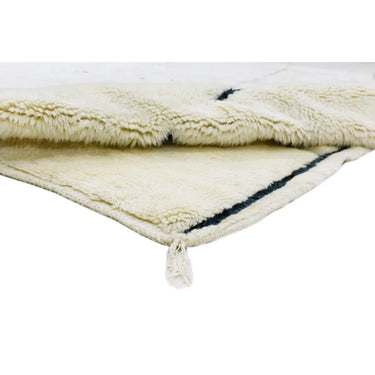The manufacturing process of our Berber carpets takes place in a traditional and 100% natural way. Starting with the procurement of the raw material, through the dyeing of the yarn, to the final knotting. Due to the manual production, a natural layer of fat remains on the fibers when the wool is washed, which makes the carpet self-cleaning, so to speak. As is typical for most Berber carpets, this Beni Ourain also has fringes on one side and a narrow kilim beam on the wide sides.