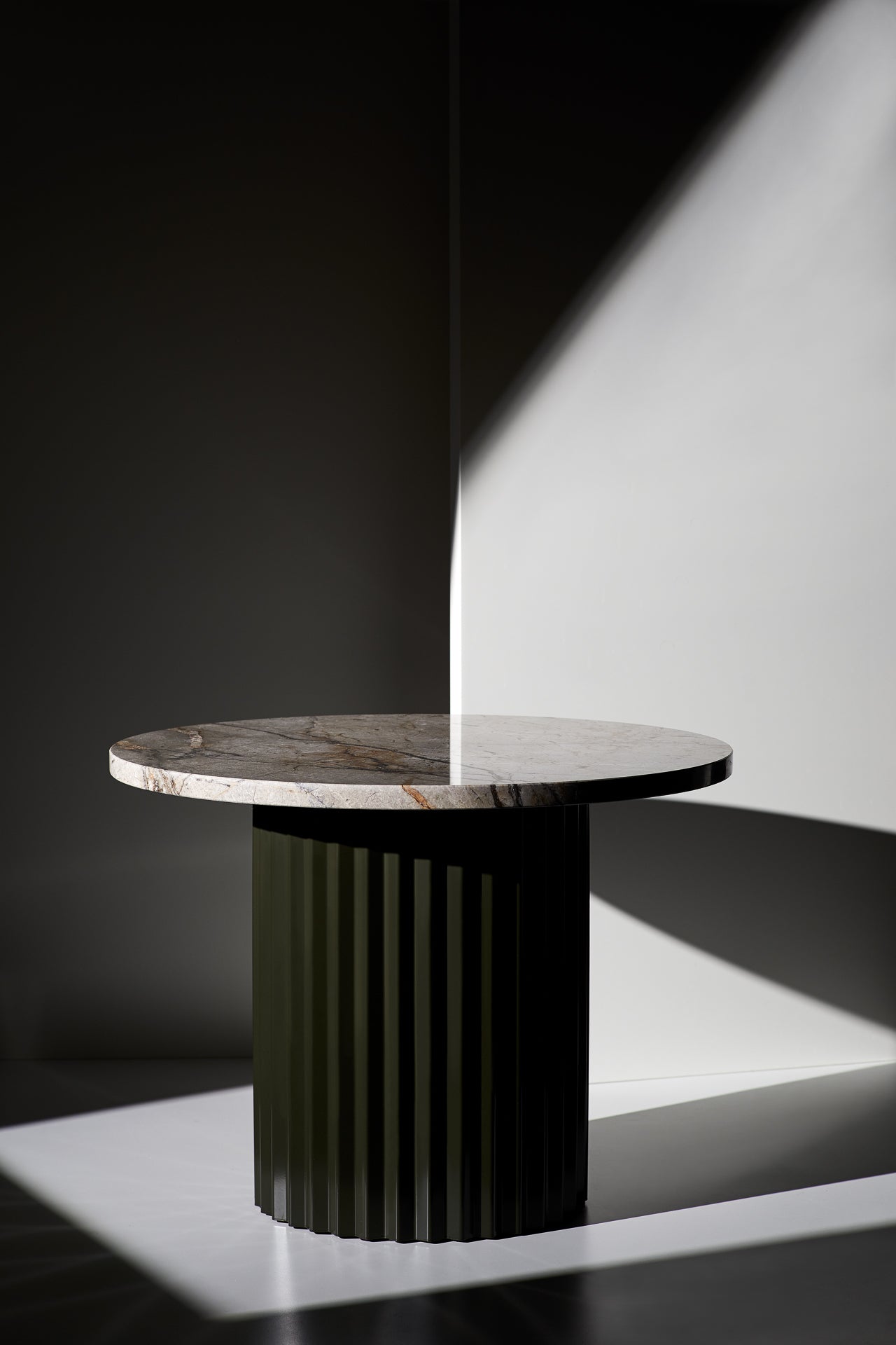 Inspired by the grand columns from ancient architecture that carries the weight of structures above the column table represents the essence of strength. As a symbol of power and magnitude the column table is made of strong steel and solid fine marble. The Column Table is a sculptural praise of the human strength.