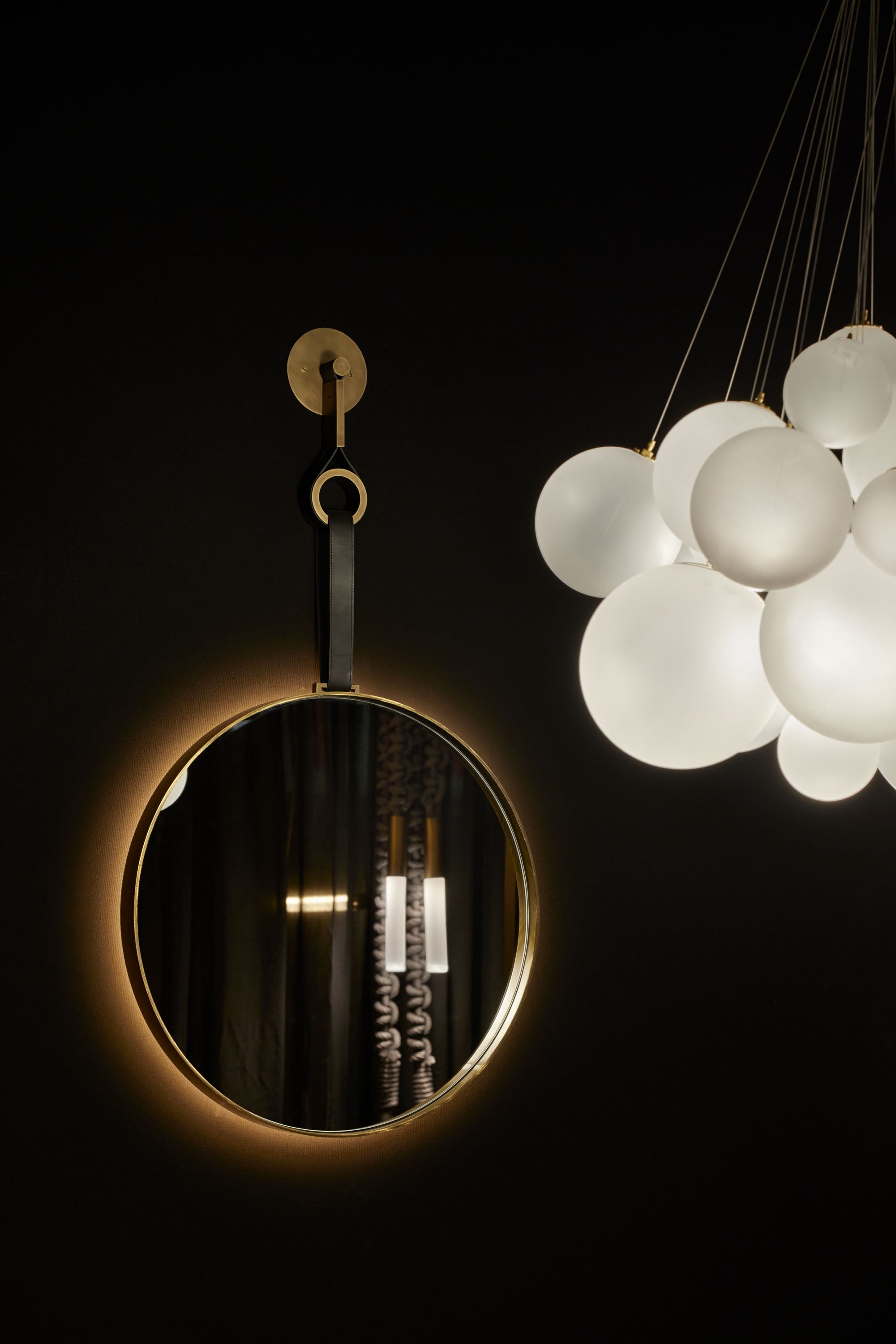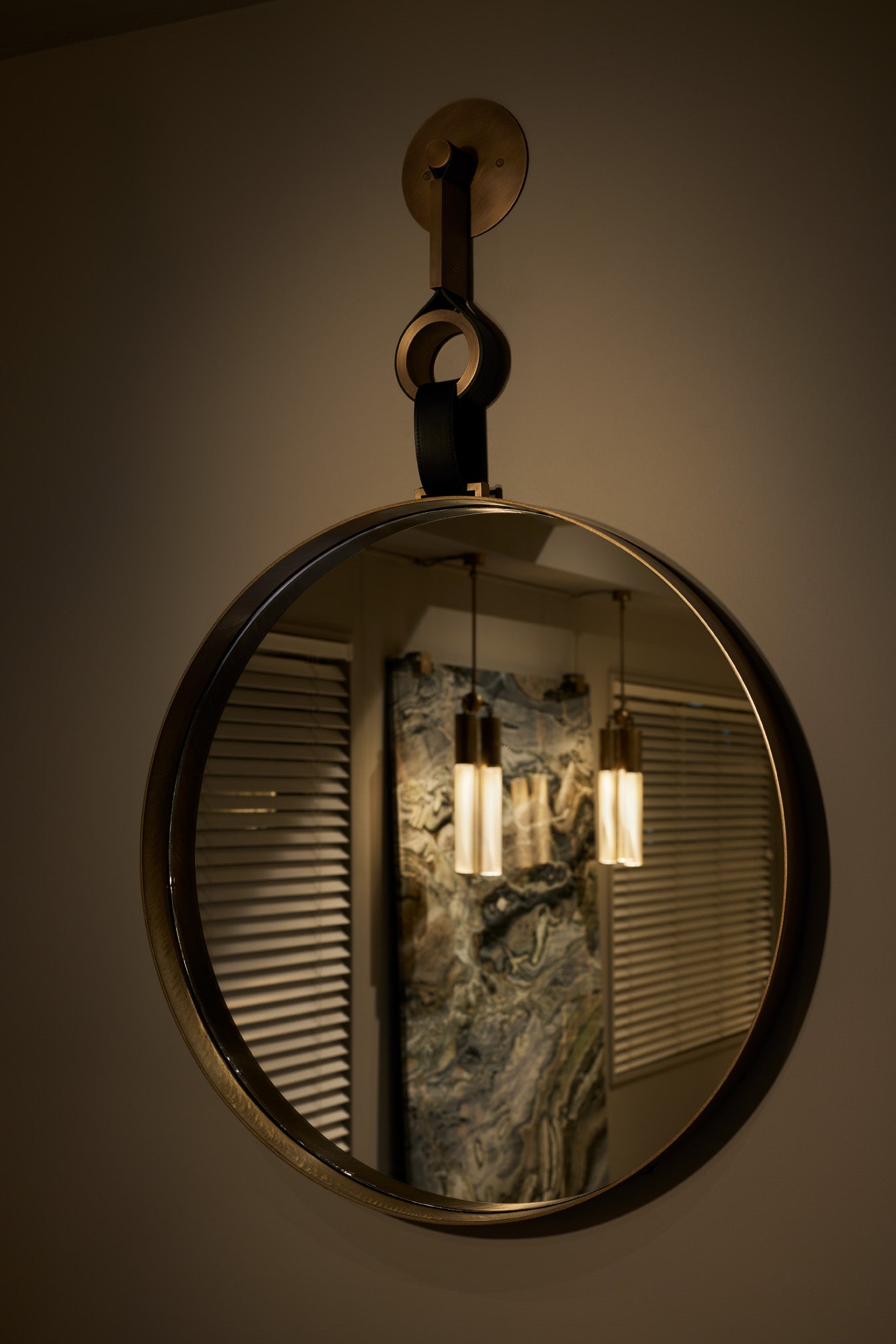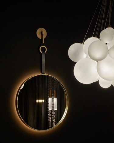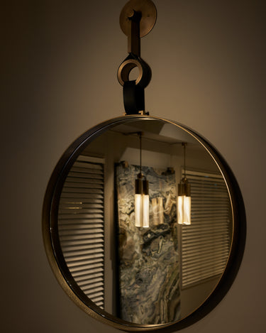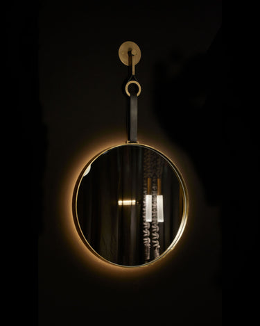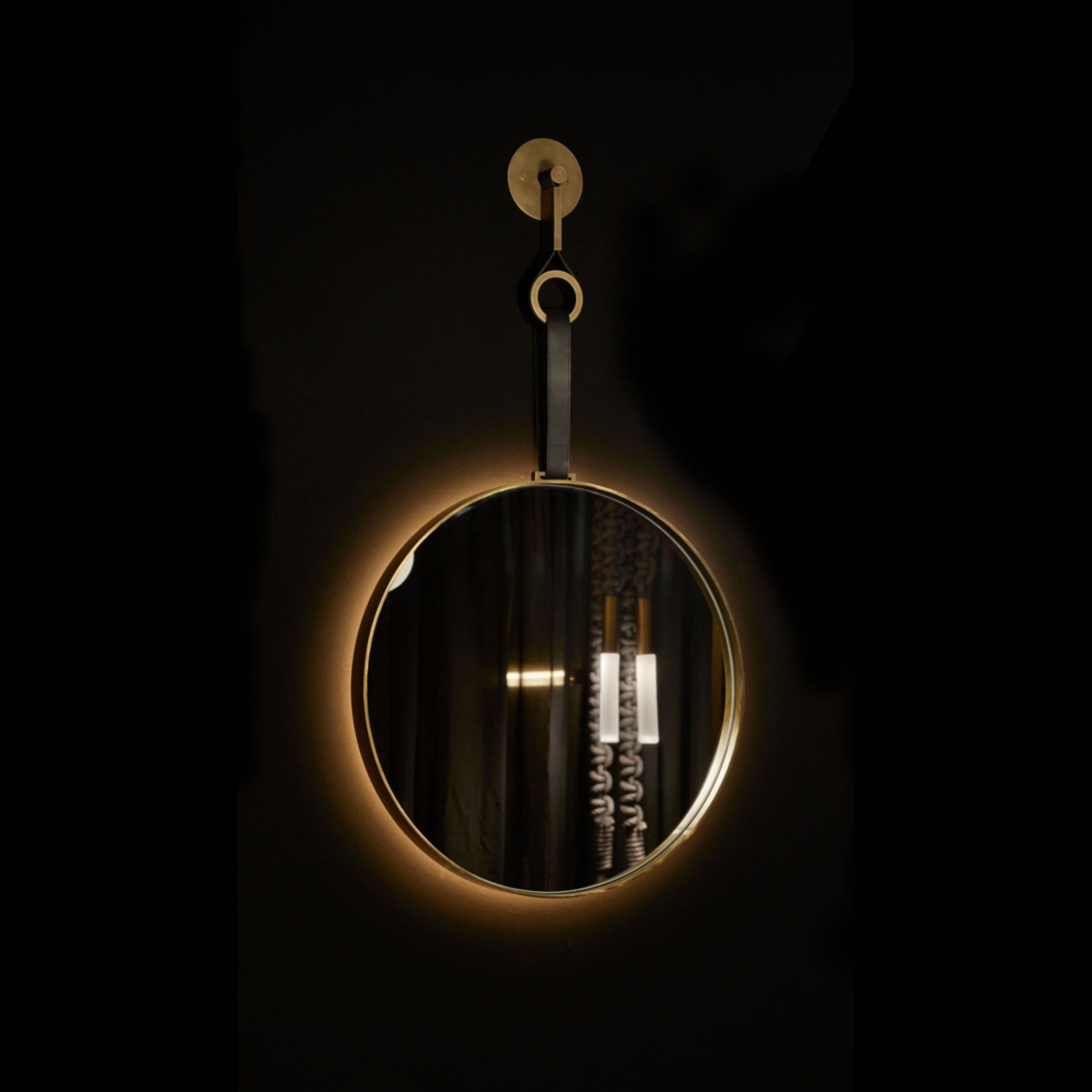 Spejlet er praktisk og stilfuldt ophængt med et læder bælte, der giver et ekstra lag af sofistikation og samtidig sikrer stabil ophængning. Læderremmen giver spejlet et minimalistisk og moderne udtryk, der harmonerer smukt med det rå messing og LED-belysningen.