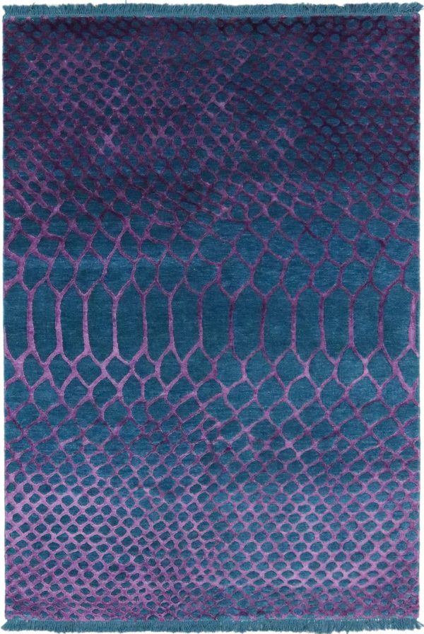 "The Snake rug has a striking decor developed by our in-house design team. It was made from wool and pure bamboo silk in India. The inspiration for this design is clearly the scaly snake skin. The combination of colors and materials supports the depth of the design. The petrol-colored scales made from wool are defined by purple frames made from bamboo silk.